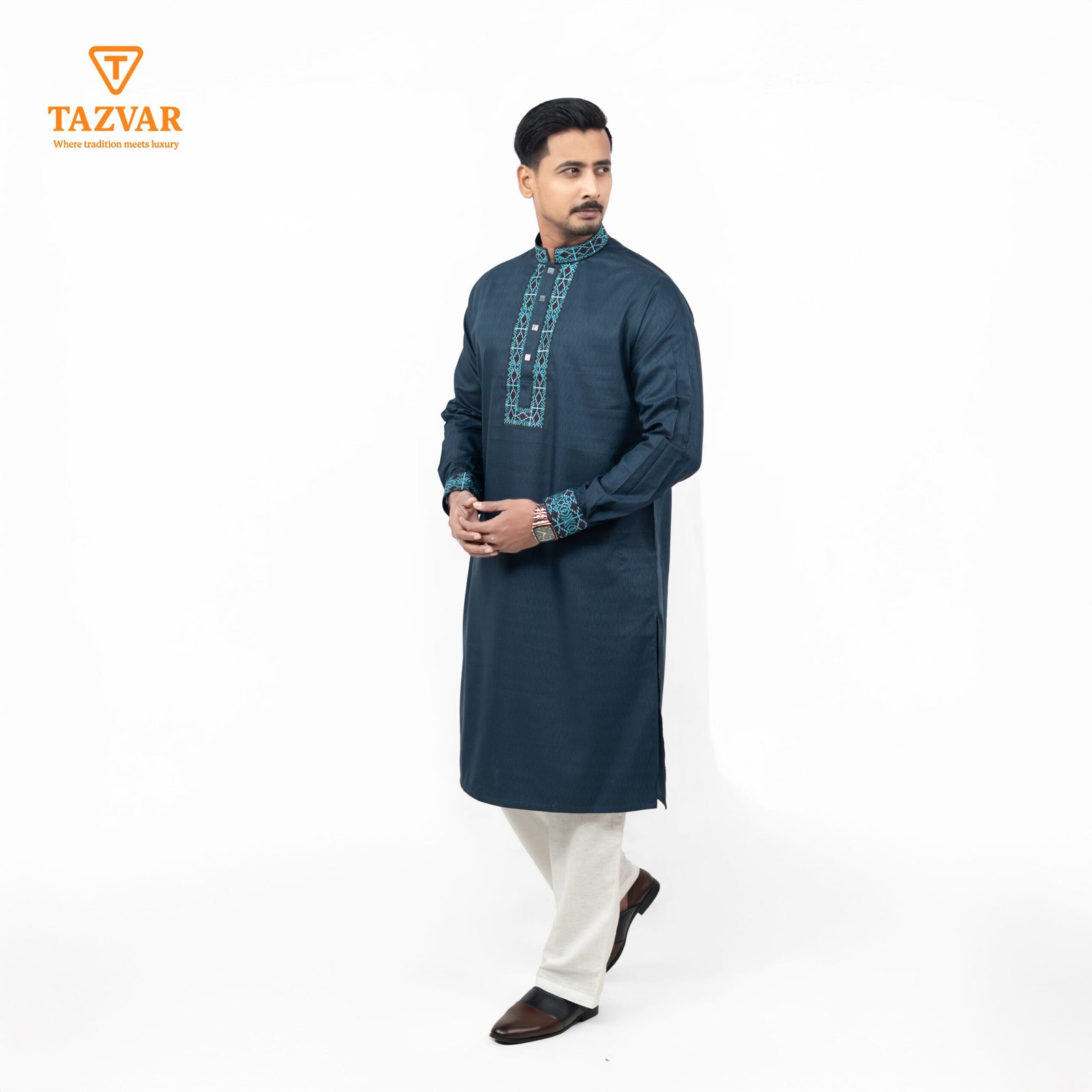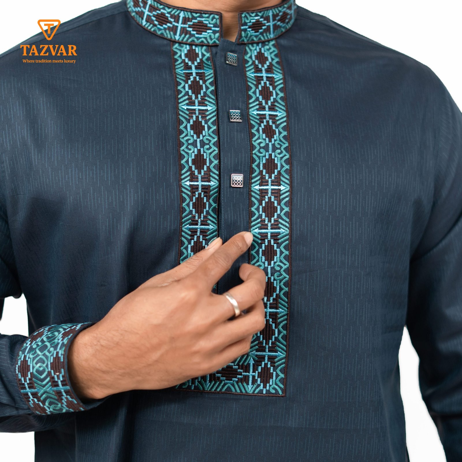 Make a refined statement this Eid with TAZVAR’s Luxury Panjabi – Eid Collection 2026. presented in a rich Deep Teal Blu shade that reflects elegance and modern tradition.