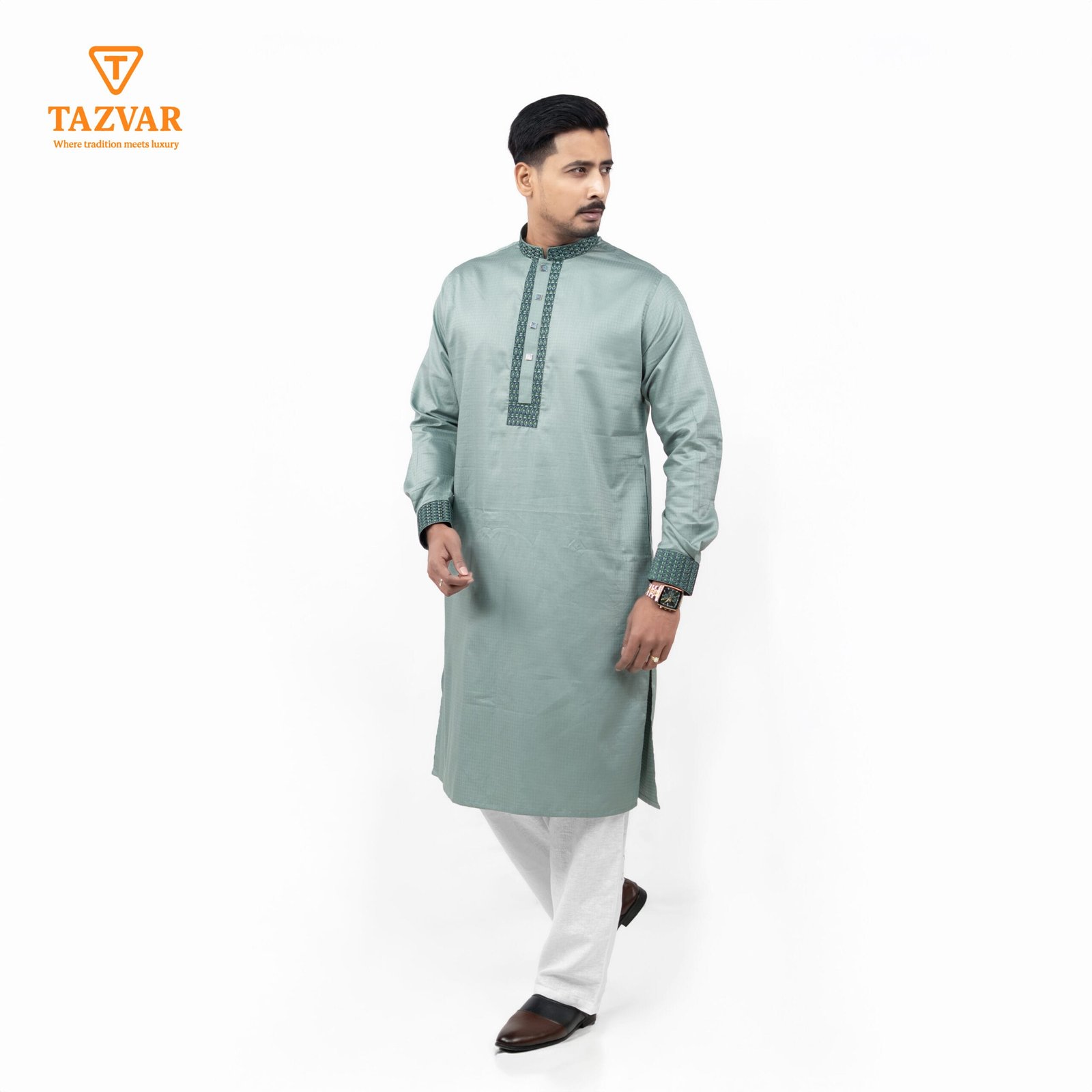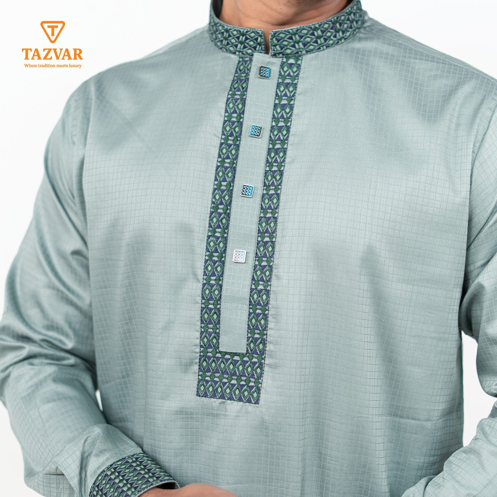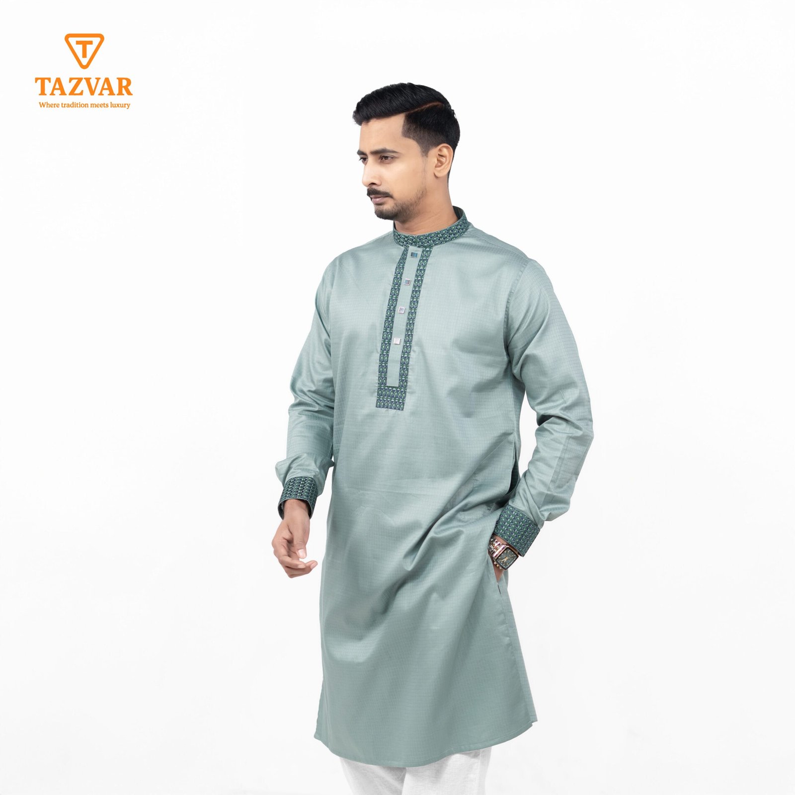 Step into Eid with refined elegance in this Luxury Panjabi from TAZVAR’s Eid Collection 2026. Made from Imported Shirting Cotton Fabric, this panjabi is desigend to provide all-day comfort without compromising on style. The soothing Ash Green shade delivers a clam, modern look, while the intricate embroidery and tailored detailing add a touch of understated luxury.