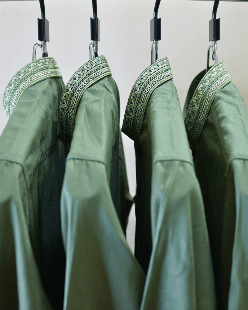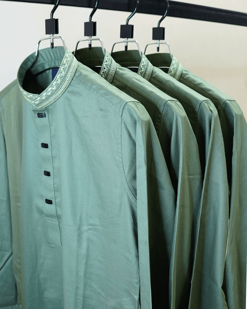The soothing sage green tone pairs beautifully with a delicately embroidered collar. Complemented with premium matte black buttons, this design balances modern sophistication with traditional grace.